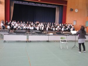 1年生92人が一丸となり、歌唱・合奏において心を一つにした美しいハーモニーを目指し、リズムや声の響きを合わせようとしています。明日は校内音楽発表会です。全校生に練習の成果を発揮します。