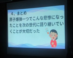 学年総合で、平和学習のまとめとして、各クラスから2名の代表者が、プレゼンテーションをしました。発表している子の準備を手伝ったり、目線を合わせて聞いたりなど、友だちを大切にする姿がたくさん見られました。平和学習を通して、学年としてぐんと成長することができました。