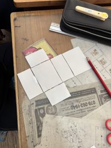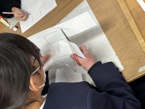 「面の形はどうなっているかな?」「同じ大きさの面はどこにある?」と、設計図(展開図)を一生懸命に考える、ハサミで切り抜き、セロハンテープで組み立てていくと…立派な箱の完成しました!