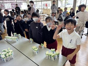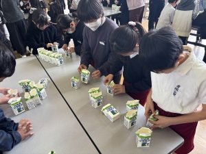 今日は給食委員会による「牛乳パック箱詰め大会」が開催され、4年生の代表選手が出場しました。