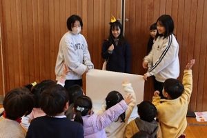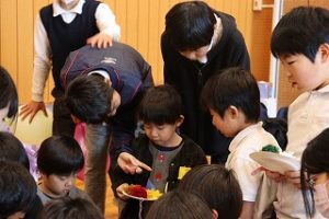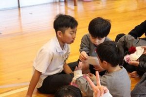 1学期・2学期と学期に1回ずつこども園との交流会を行いました。今回は全体遊びを5年生の学級代表たちで企画し、その後に各クラス3グループに分かれ、グループごとに考えた遊びを行いました。自然と目線を合わせて話したり、手をつないで誘導したりする5年生の姿が素敵でした。