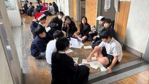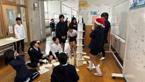 5年生でクリスマスのイベントを行いました。はじめにサンタが登場し、そこから宝探しやペーパータワーをしました。実行委員の人たちは頻繁に休み時間も進んで集まり、今日まで準備をしてくれました。楽しい企画でした!