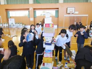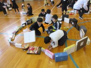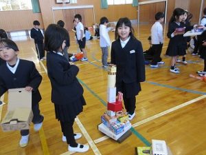 友だちと協力して箱を積み上げたり、長くつなげたりしながら、体育館いっぱいに思い思いの作品が広がりました。一人では作れない大きな形も、学年のみんなで力を合わせればいろいろな作品が仕上がりました。