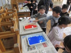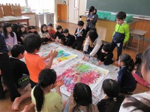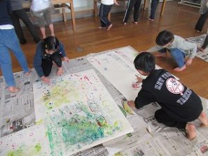 「これ、お花みたいに見える!」「ローラーで道ができたよ!」と、あちこちで歓声が上がっていました。手が絵の具だらけになるのも忘れて、夢中で画用紙を彩りました。